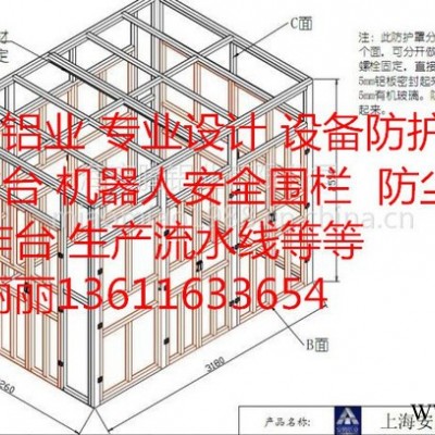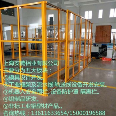 围栏框架一般使用AT40系列、AT30系列和AT45系列铝型材制作、防护板根据不同的工作环境则选、一般无特殊的情况下使用透明有机玻璃、亚克力板、PC 板与铝塑板、镀锌网格等板材与板材颜色可供选择、防护围栏与地面才接采用AT地脚连接件B、此配件无论是连接型材与连接地面的部位都非常牢固、使用铝型材制作的防护围栏具有整体美观性好、拆装方便、连接牢固、使用寿命长、可再次利用、方便清洗等特点,是目前市场广泛应用的产品、客户只需描述现场需要安装防护围栏的情况,给出相应的尺寸我们公司会设计出标准的三维图与二维图纸给客户看效果、当然也可以我们公司自行测量在设计出图。